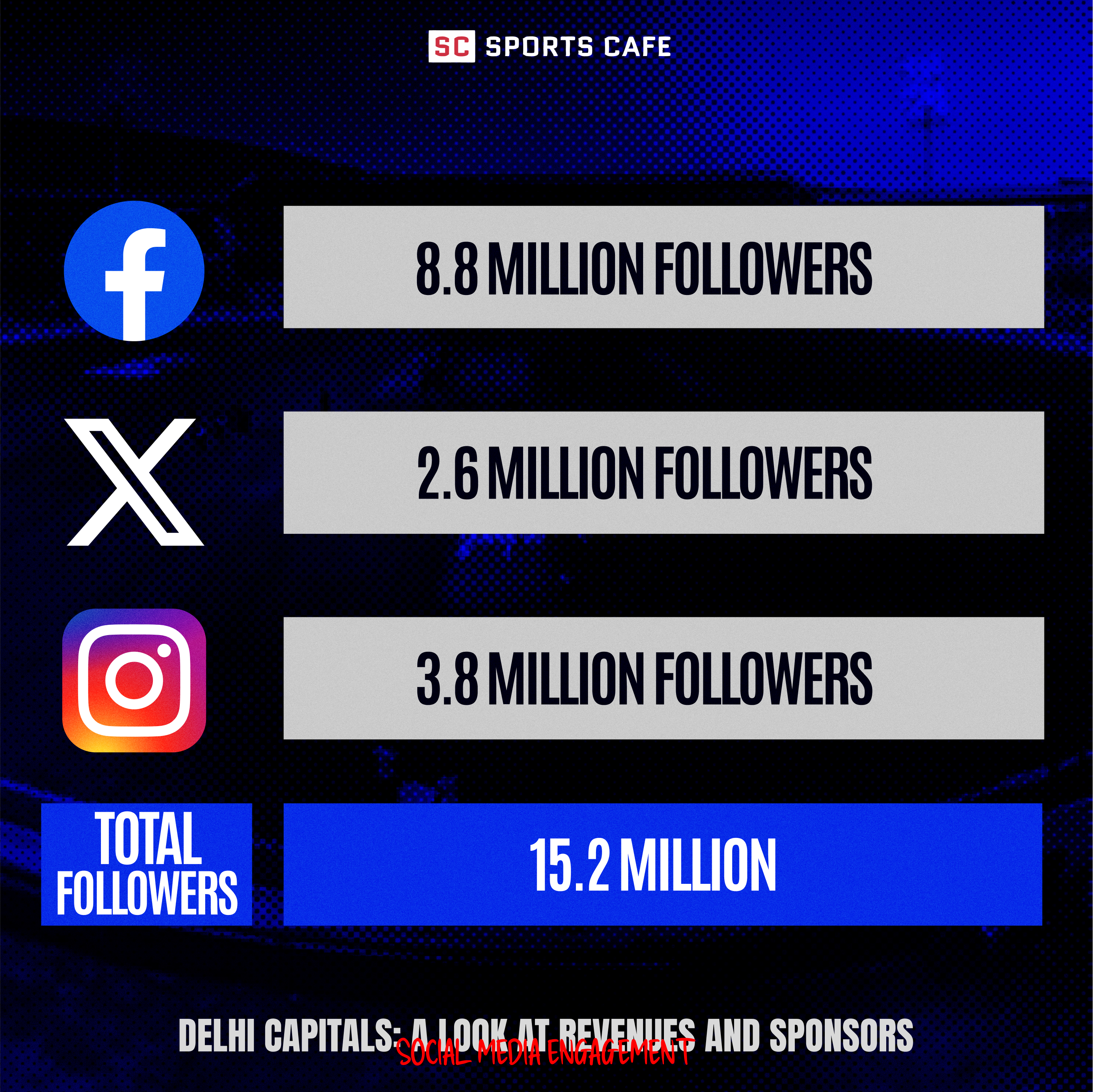 The Delhi Capitals have 15.2 million followers across major social media platforms. They rank 6th among all IPL teams in terms of the number of social media followers.