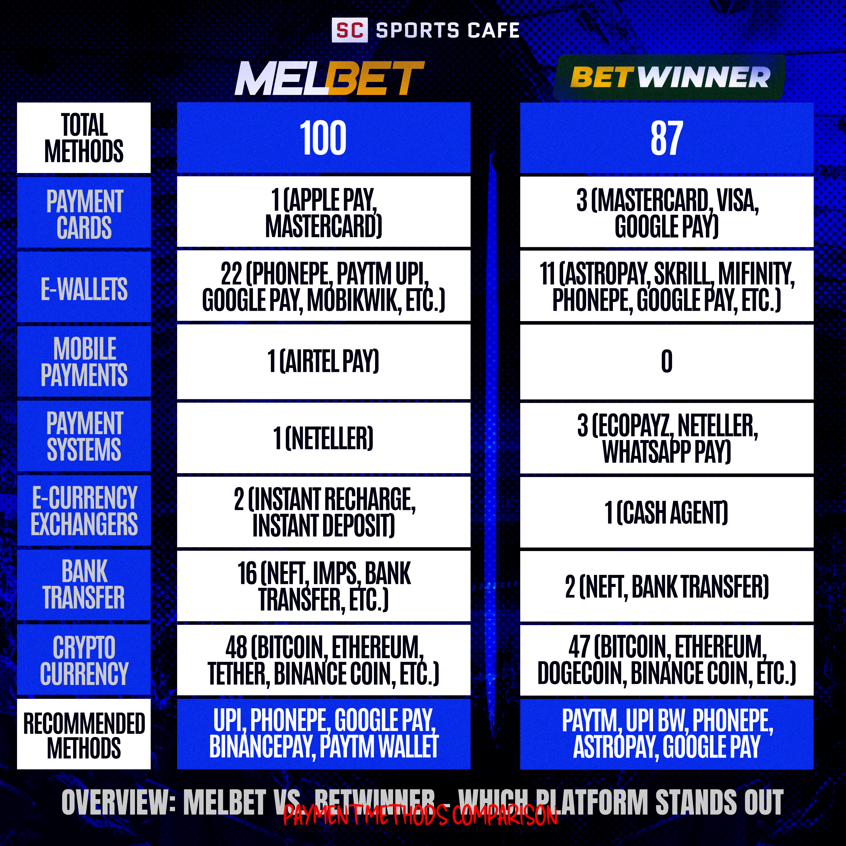Melbet and Betwinner both provide a wide range of sports and casino betting options. Melbet has a larger selection of payment methods and social media platforms. It also has unique features like bonus buys and various slot mechanics. Betwinner, though slightly limited in payment methods, focuses on a strong gambling experience with many sports events and reliable features. Melbet offers more game options and features, while Betwinner focuses on accessibility and solid betting options for users. Both platforms serve customers well, with Melbet being more diverse in its offerings and Betwinner being easy to use.