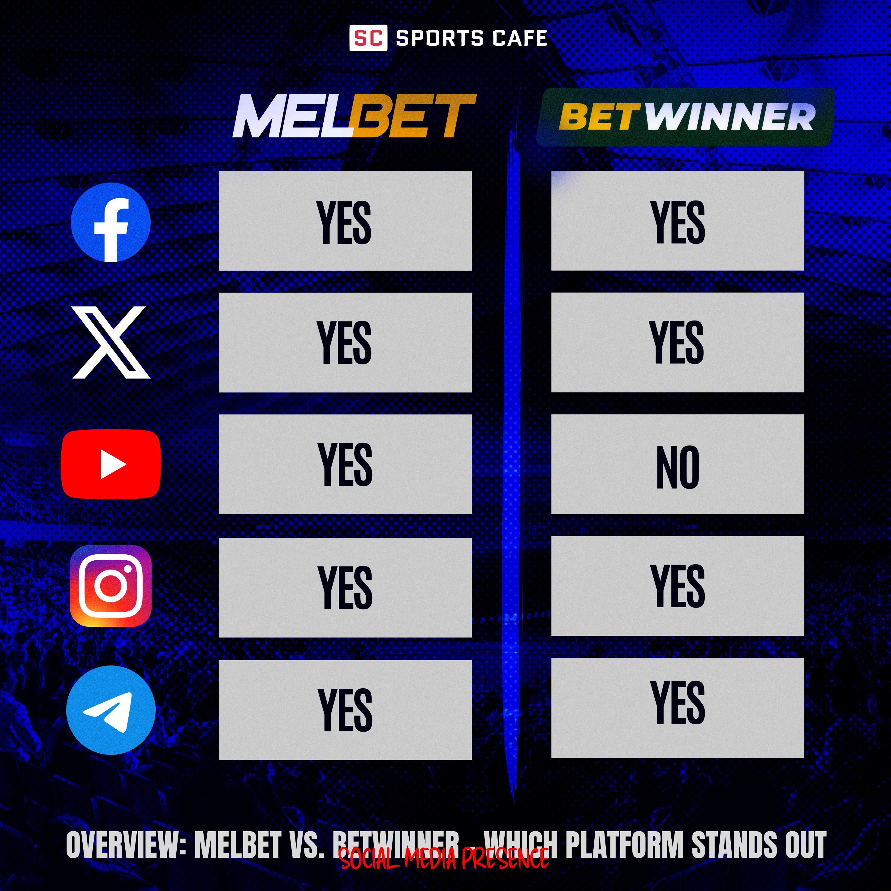 Both Melbet and Betwinner are active on social media to stay connected with customers. Melbet has a presence on more platforms, while Betwinner focuses on a few key ones.