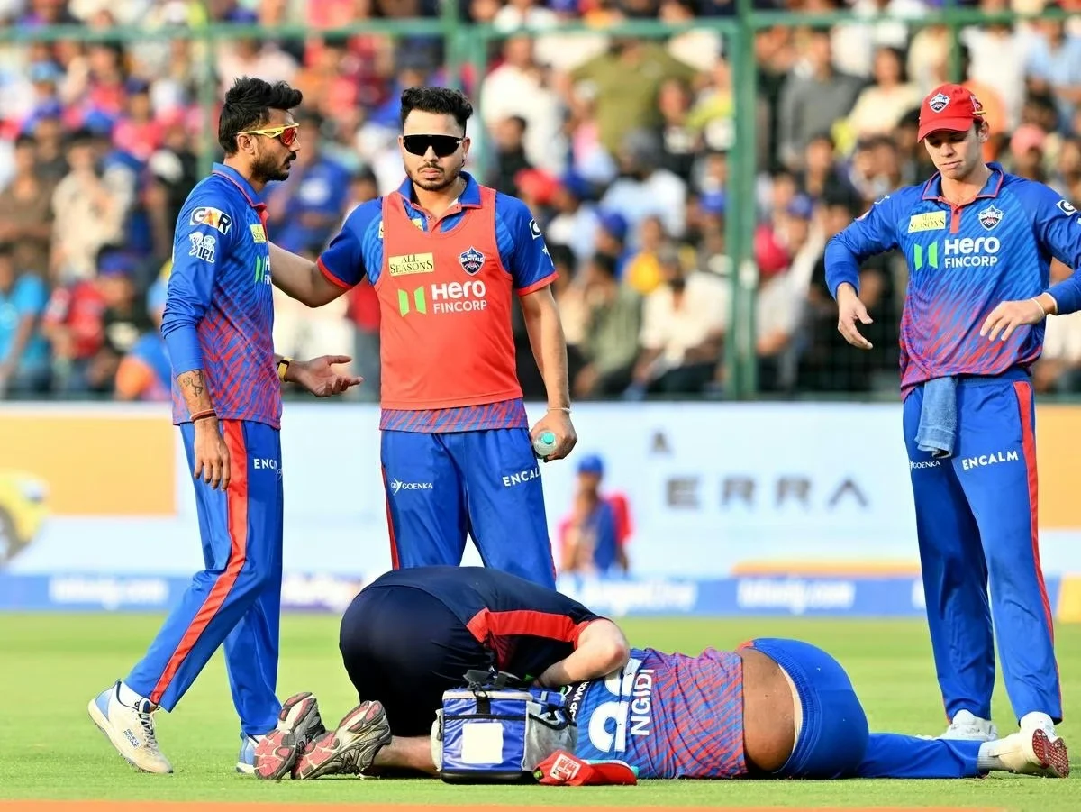 Lungi Ngidi made an attempt to take a catch while running backwards in the powerplay. While he was not able to take the catch, he fell down on his neck during this process. The other fielder who stood near Ngidi threw the ball to the bowler's end, and immediately noticed that Ngidi was not fine. The medics were called upon, and DC eventually brought in Vipraj Nigam as a concussion sub.