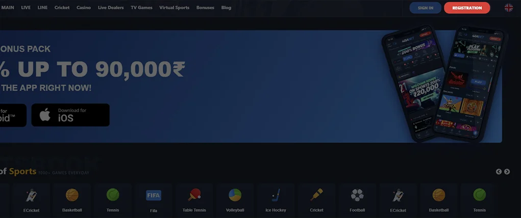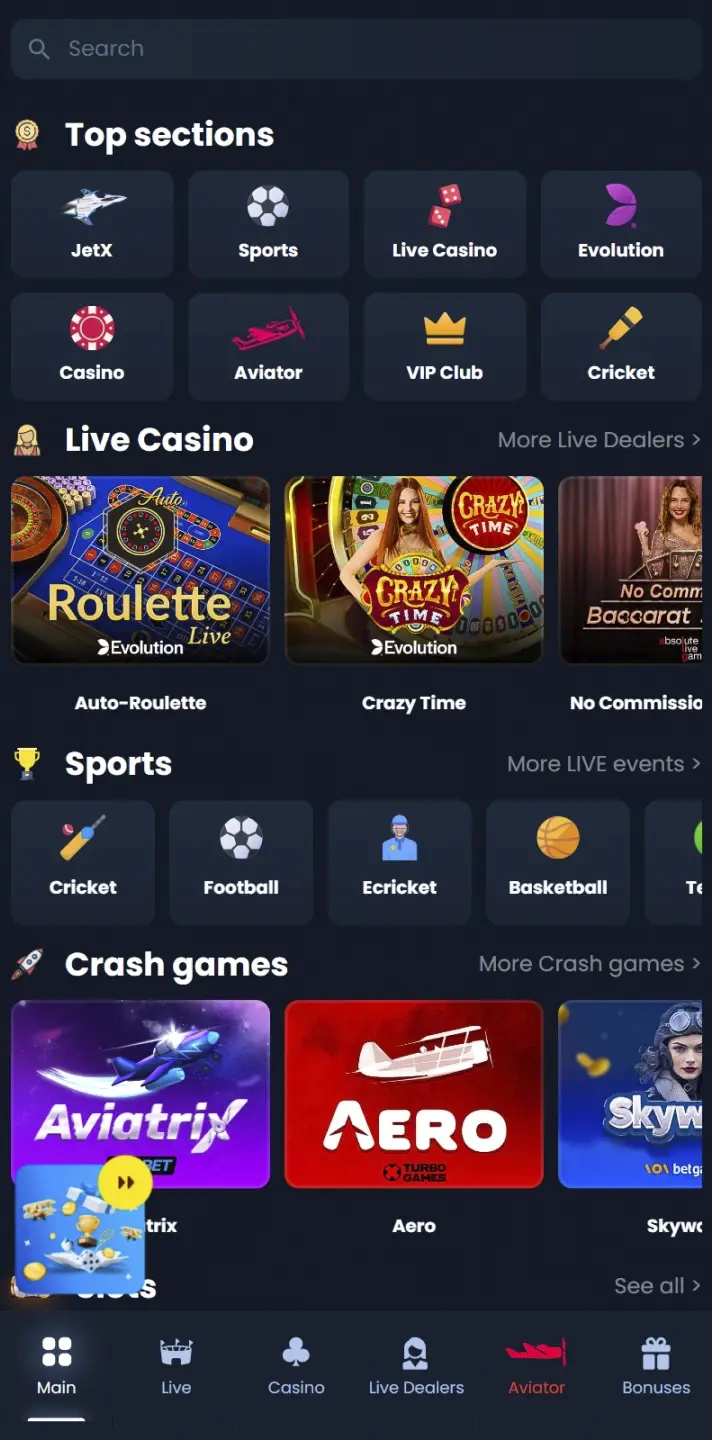 Sports, Live Sports, Cricket, Casino, Live Dealers, TV Games, Virtual Sports, and so on